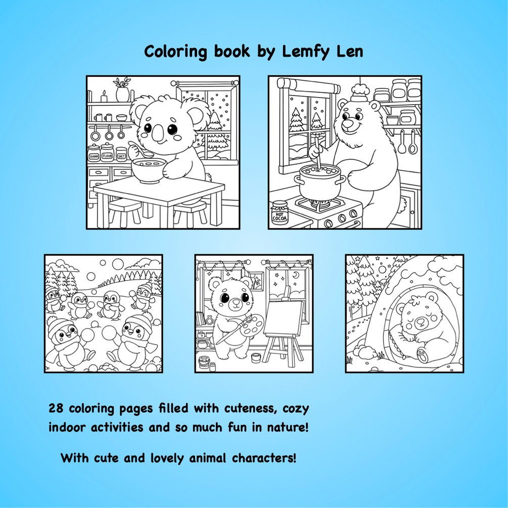 28 coloring pages filled with cuteness, cozy indoor activities and so much fun in nature! With cute and lovely animal characters!